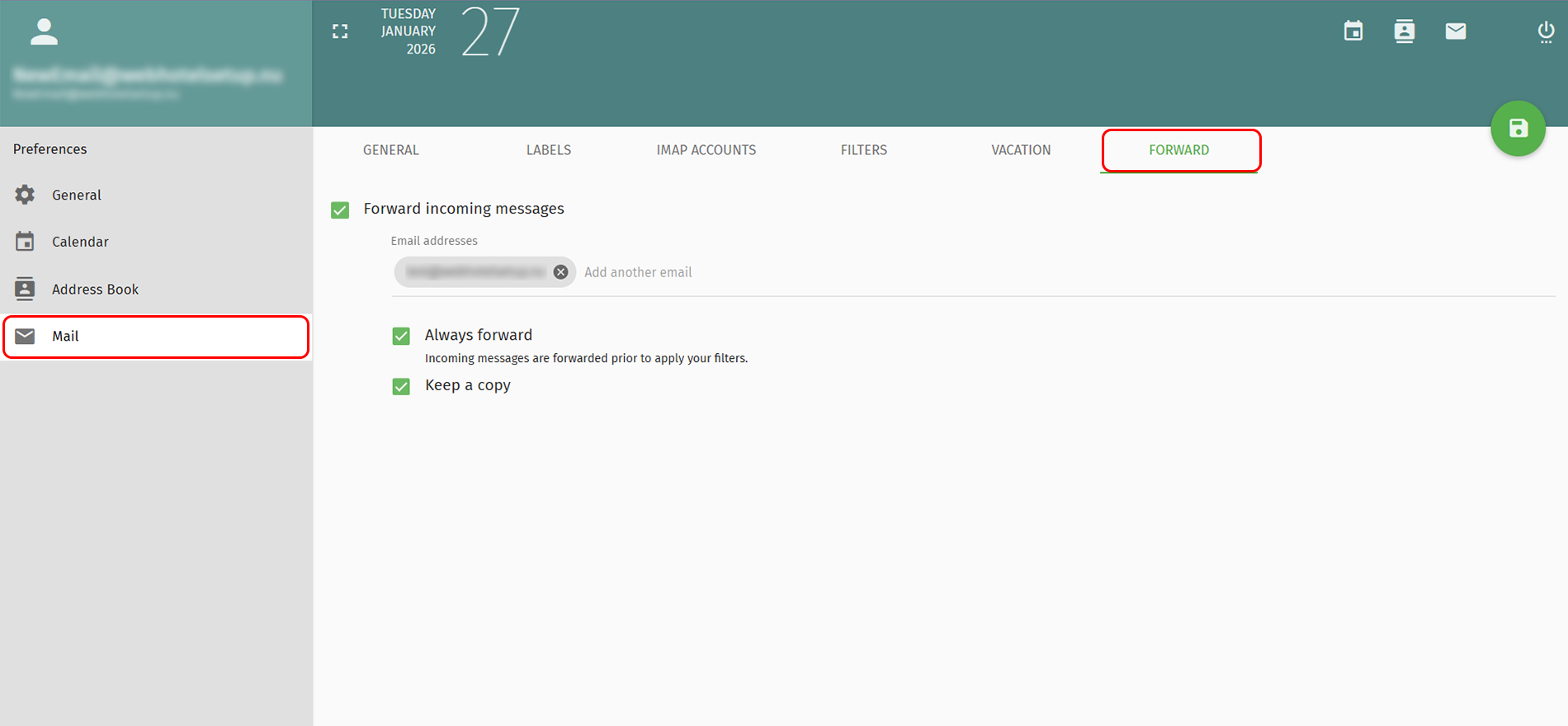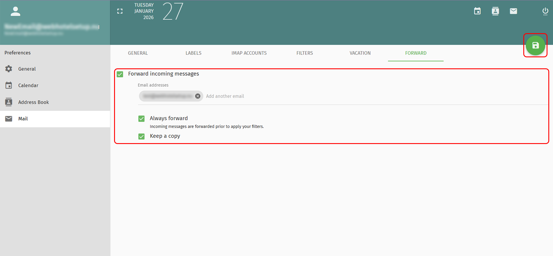 Webmail account settings - How to redirect emails from SOGo webmail?